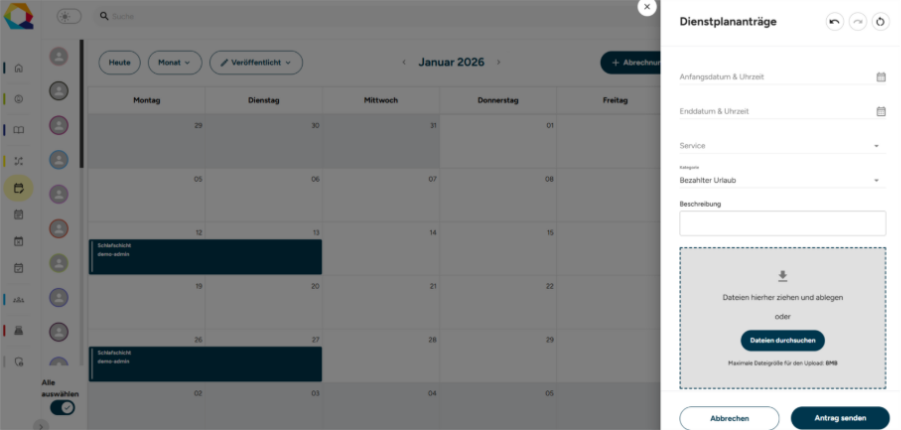 Der Bereich „Anträge“ ermöglicht es Mitarbeitenden, schnell und unkompliziert verschiedene Arten von Abwesenheiten oder Schichtwünschen einzureichen. Alle Anträge werden zentral gesammelt und können später von berechtigten Personen geprüft und verwaltet werden.