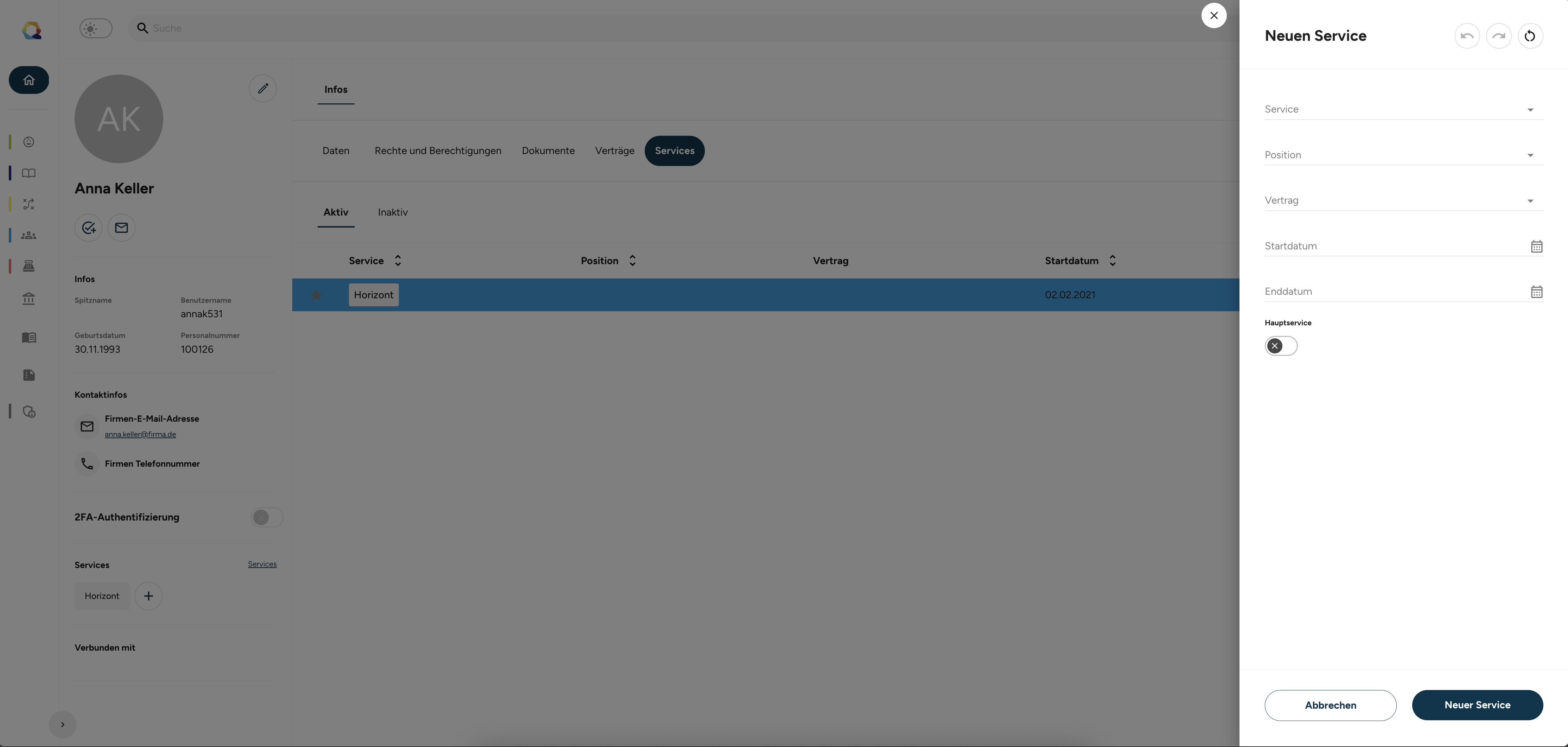Füge einen neuen Service über das + -Symbol in der Personenübersicht links hinzu und wähle im rechts im Menü im Dropdown-Menü den entsprechenden Service, die Position und weitere Details aus.