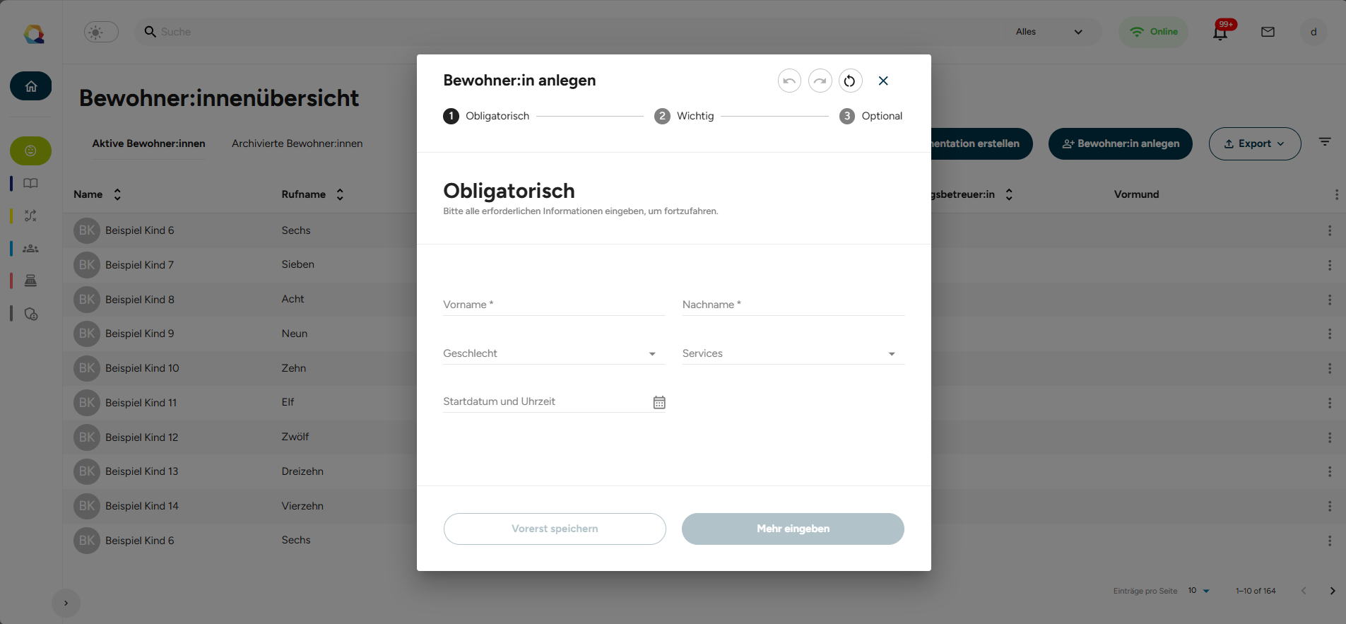 In der Bewohner:innenübersicht befindet sich der Button „Bewohner:in anlegen“, über den der Anlegeprozess gestartet wird.