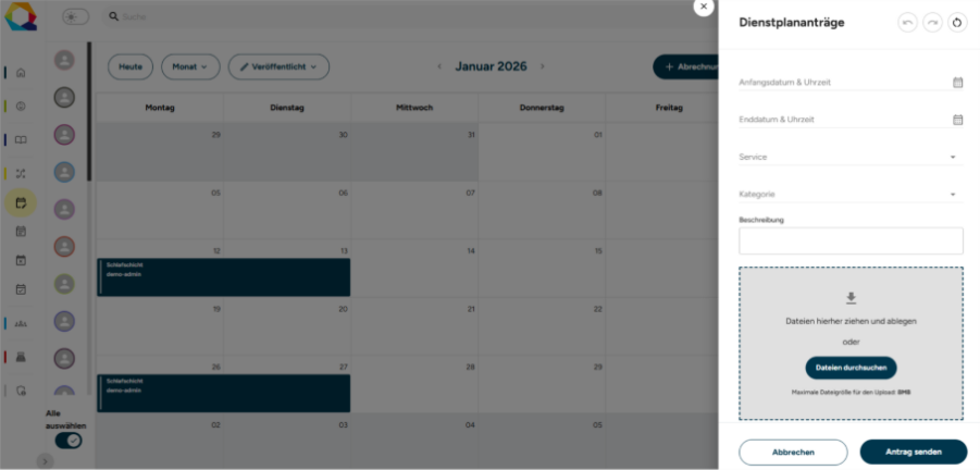 Im rechten Menü befindet sich die Option Planen, darunter als erstes der “Dienstplan”. Sobald die allgemeine Übersicht offen ist, gibt es in der Leiste mit den Optionen die Aktion “+ Antrag”. Darüber öffnet sich rechts ein Fenster, in dem du alles Notwendige ausfüllen kannst. Anfangs- und Enddatum, Service um den es geht, Kategorie der Schichtart. Auch persönliche Notizen und Anmerkungen können hier hinterlassen werden. Außerdem kannst du ein Dokument hochladen, falls dies erforderlich ist.