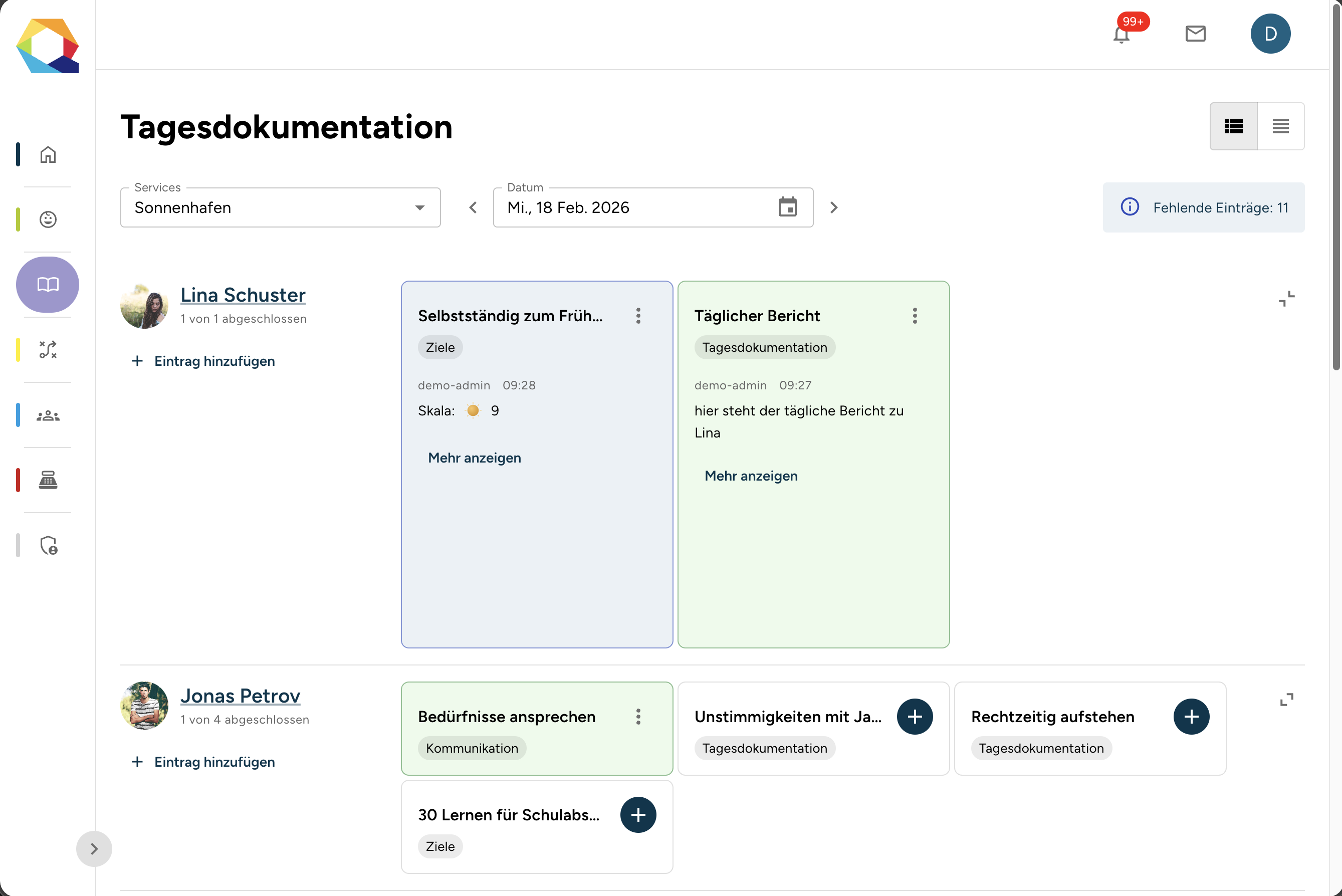 Der Eintrag erscheint danach in der Tagesübersicht blau hinterlegt in der Zeile der jeweiligen Bewohner:in.
