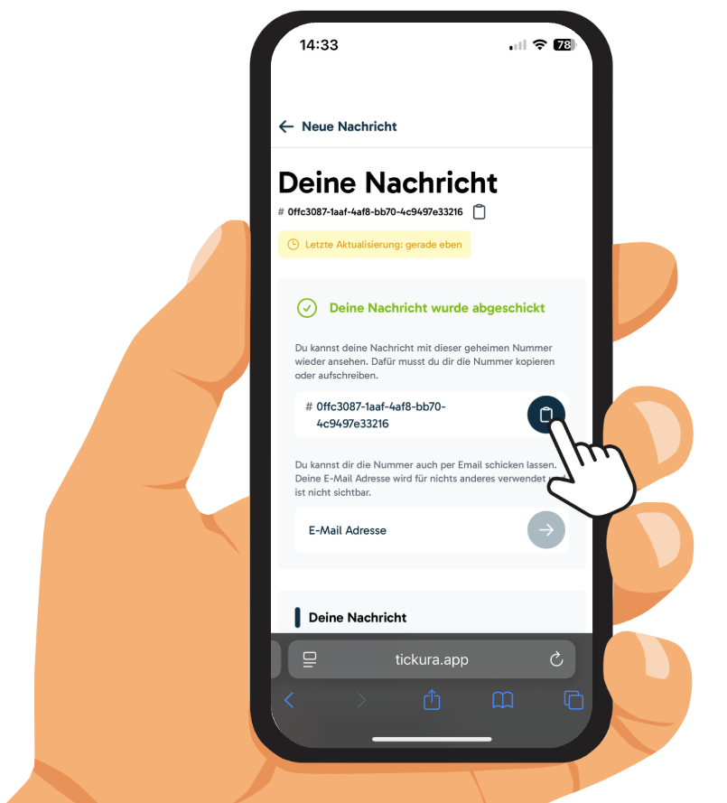 Nach dem Absenden des Tickets wird ein sehr langer einzigartiger Code angezeigt. Dieser Code ist notwendig, um später wieder auf das Ticket zugreifen zu können.