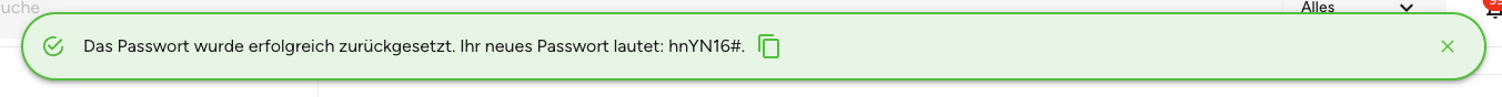Dort wird angezeigt, dass das Passwort erfolgreich zurückgesetzt wurde und das neu generierte Einmalpasswort.