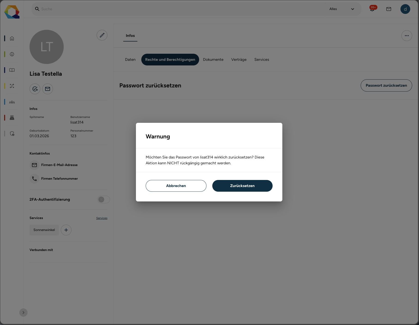 Nicht alle Mitarbeiter:innen können die Passwörter anderer Mitarbeiter:innen zurücksetzen. Diese Funktion steht in der Regel nur bestimmten Rollen, zum Beispiel Administrator:innen oder Leitungspersonen, zur Verfügung.